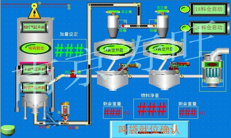 此控制系統(tǒng)為:噸袋卸料站+計量+輸送+除塵為一體的自動化設(shè)計方案。